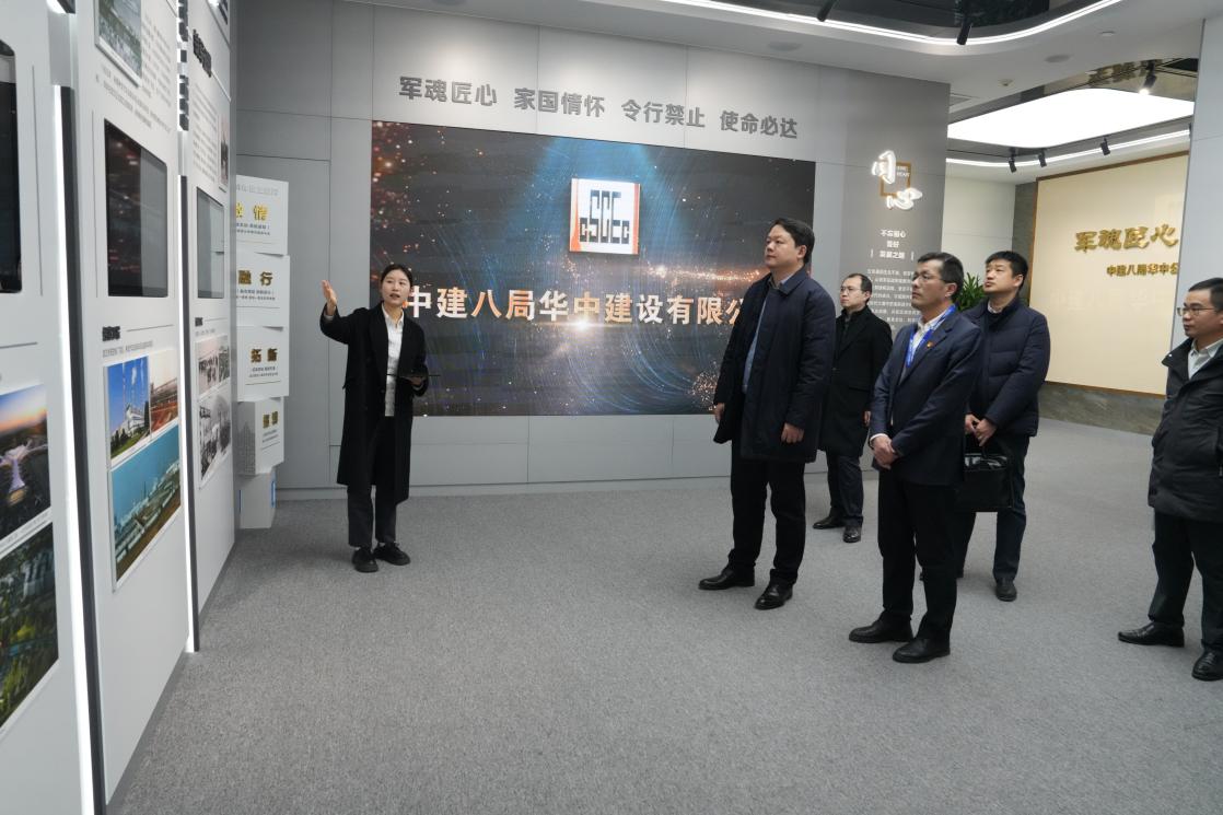 会议开始前,中建八局华中建设有限公司党委书记、董事长徐玉飞带领公司一行参观了公司企业文化展厅,详细介绍了公司发展历程、标志性成果、企业文化等内容。
